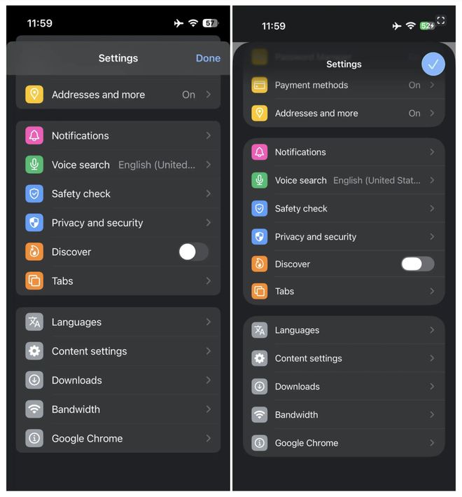 新版还对上下文菜单进行了改版,取消了背景虚化,转而采用更现代的平面化设计;底部弹出菜单不再铺满屏幕边缘,四角圆润度提升,设置界面也获得了全新「完成」图标与更新后的开关样式。