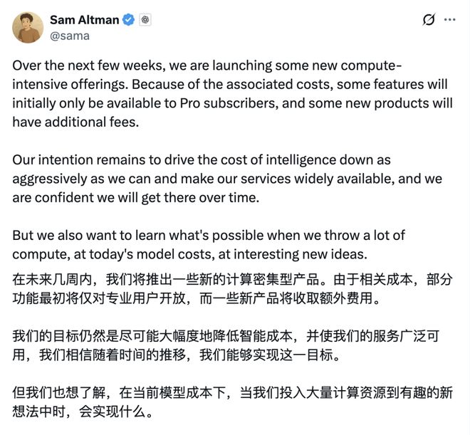 OpenAI 首席执行官 Sam Altman 今日在社交平台 X 上发文表示,未来几周内将推出一系列「计算密集型」新功能与产品。