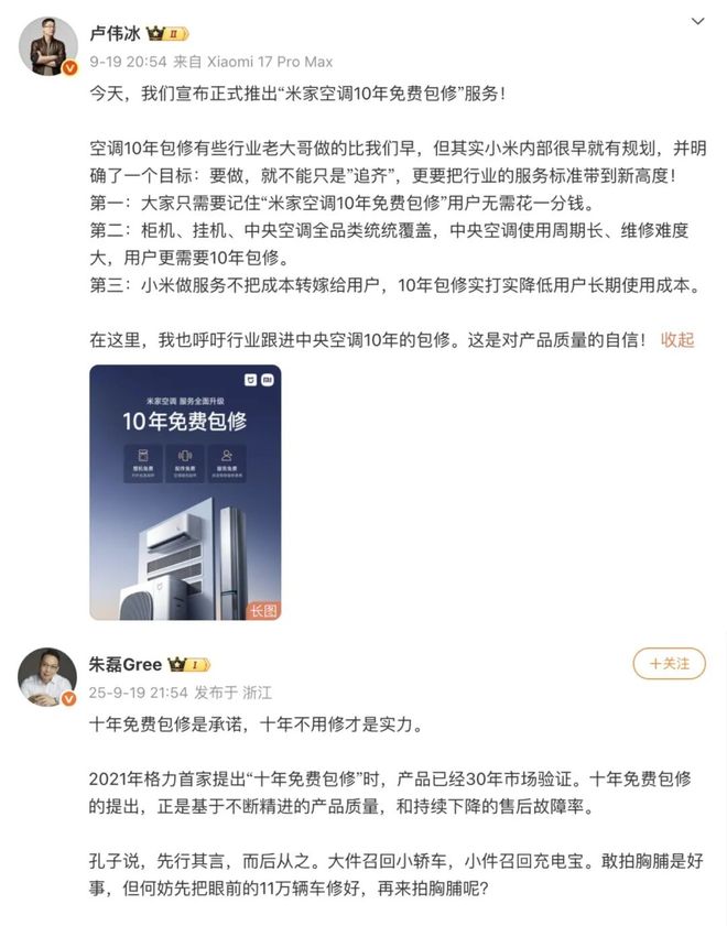 小米集团总裁卢伟冰此前通过社交平台宣布,米家空调正式推出「10 年免费包修」服务,涵盖全系列产品。