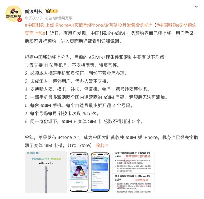 有消息称,苹果 iPhone Air 国行版预计将在 10 月正式发售,但仅通过三大运营商的合约机渠道销售,苹果零售店及电商平台将不提供裸机购买。