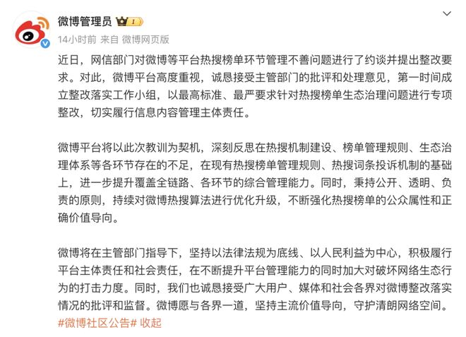 近日,网信部门针对微博等平台在热搜榜单环节管理不善的问题进行了约谈,并提出整改要求。对此,微博方面表示已高度重视,并将开展专项治理。
