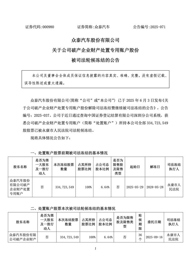 与此同时,公司破产企业财产处置专用账户所持 3.35 亿股股票被永康市人民法院轮候冻结,占该账户所持股份的 100%,占公司总股本的 6.64%。