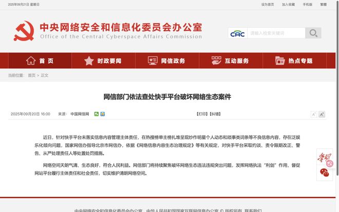 近日,针对快手平台存在的问题,国家网信办指导北京市网信办,依据相关法规,对快手平台采取了约谈、责令限期改正、警告及从严处理责任人等措施。
