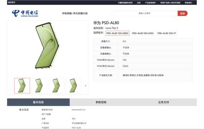 型号为「PSD-AL80」的华为 nova Flip S 小折叠手机近日出现在中国电信终端产品库中。