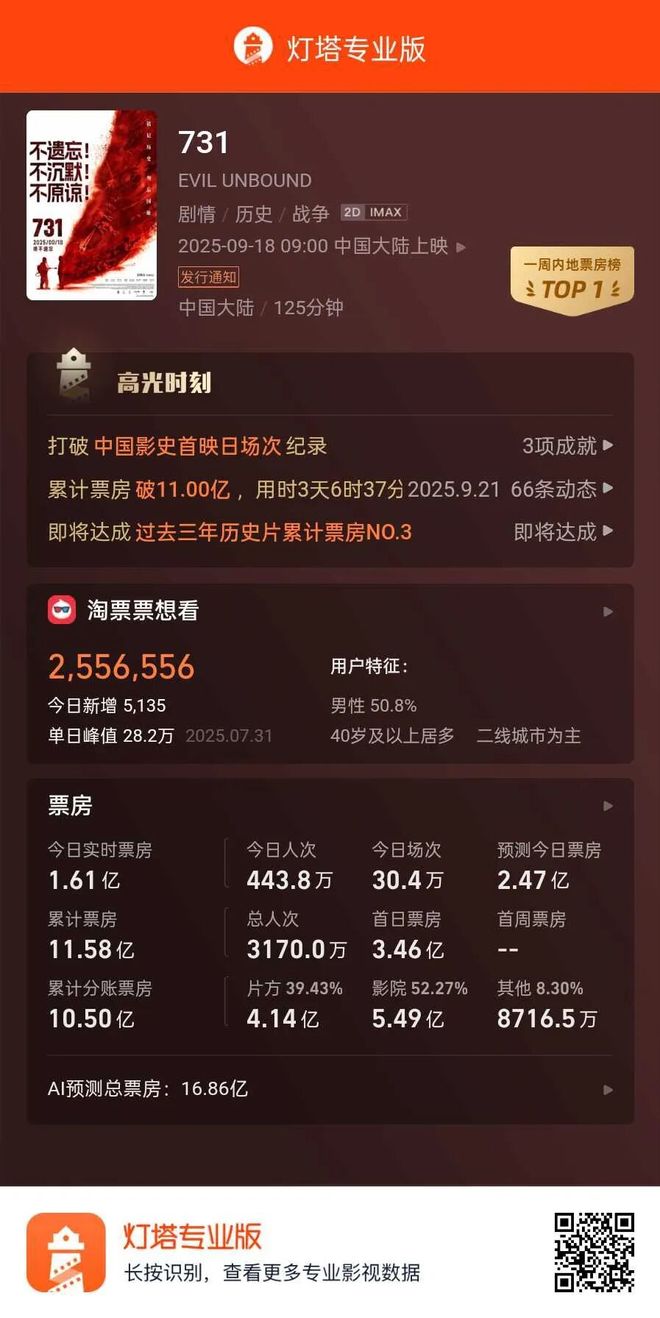 同时,《731》还包揽了中国影史 9 月单日票房冠军、单片单日总场次榜冠军以及首映日总场次榜冠军等多项纪录。