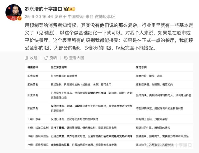 罗永浩指出,如果是在超市或平价快餐厅,他可以接受表中所有级别的预制菜;而在正式餐厅,他仅能接受全部的 I 级、大部分的 II 级、少部分的 III 级,至于 IV 级则「完全不能接受」。